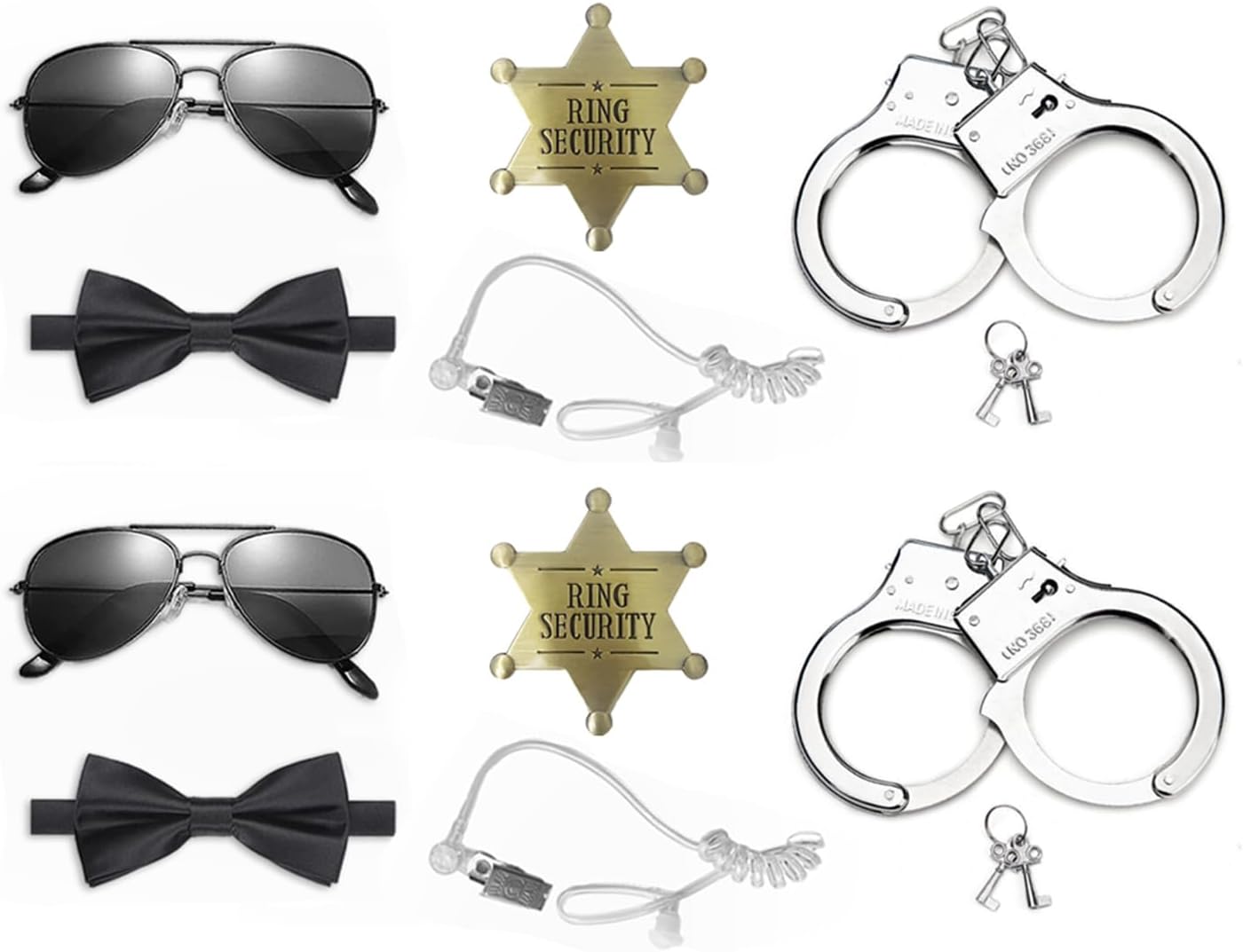 Package included: 1pcs of ring security box + 2pack of gifts(2x sunglasses, 2x bowtie, 2x badges, 2xspy earpiece, 2x Toy handcuffs)